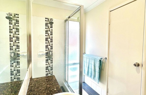The ensuite is equipped with a large mirror and a refreshing shower