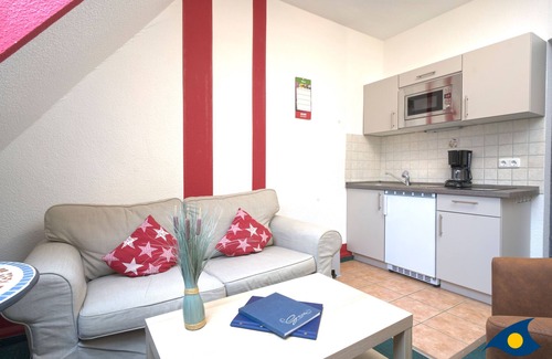 This 2-bedroom apartment offers on 36 sqm cozy attic in the house of apartments "Kirchstraße". Here spend 2 people a relaxing holiday. In addition to the living room with small dining area you have a bedroom with a comfortable double bed and ample storage space for your holiday wardrobe available. The small kitchenette is in the living room. The balcony is ideal for sunbathing or breakfast under the open sky. The bathroom with toilet and shower is equipped with a window. The apartment has an open-plan layout. On a door between the living room and bedroom has been omitted, thus the apartment looks more generous.