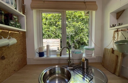 The living area opens onto the thoughtfully designed kitchen which is well equipped with an oven, grill, ceramic hob, fridge microwave, cafetière, hand blender and all the pots, pans, plates, bowls and cutlery you could need with a window onto the bird-filled Devon wall and hedging. We also provide local teas and coffee and there is olive oil, salt and pepper and sugar for your use.