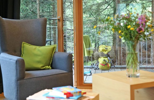 "Klassik (2SZ)", 3-room chalet 100 m2. Bright, comfortable and cosy furnishings: dining room. 2 double bedrooms, each room with satellite TV (flat screen). Living room with kitchen corner. Small, open kitchen (oven, dishwasher, 4 ceramic glass hob hotplates, microwave, electric coffee machine) with dining table. 2 showers, 2 sep. WC's. Small balcony 6 m2. Balcony furniture, box-room. Very beautiful view of the mountains and the countryside. Facilities: washing machine, dryer, safe, hair dryer. Internet (WiFi, free). Please note: non-smokers only. Maximum 2 pets/ dogs allowed. Smoke alarm. The chalet has an infrared deep heat cabin.