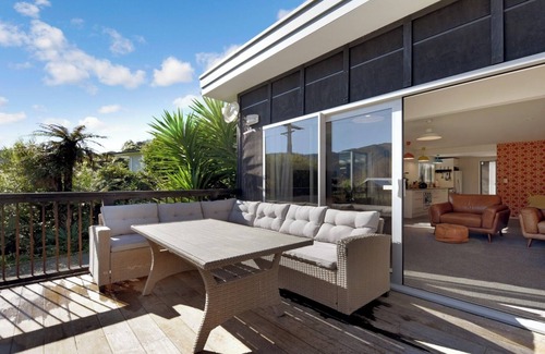 The open-plan kitchen, dining, and lounge create a welcoming space to relax, while a sliding door leads out to a deck perfect for BBQs or alfresco meals. Stylish touches and cosy furnishings create a welcoming atmosphere, and the sleepout provides extra flexibility and privacy.