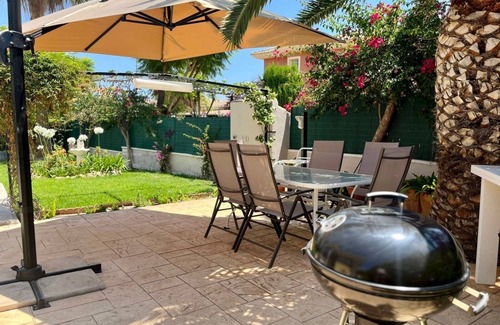 It is a private villa completely renovated with wooden floors, open spaces in the living room with a modern kitchen fully equipped with oven, microwave, steam oven, plate warmer, refrigerator, dishwasher, ceramic hob, all in stainless steel. Equipped with all the necessary household items for your stay. The laundry and ironing area is located in a separate room.Ducted air conditioning with independent climate control per room. Mosquito nets on all windows and automatic blinds.Automatic awnings in the front area. They cover the porch and living room windows. The covered porch can be left completely open or closed with glazing, it also has a ceiling fan to make your dinner parties more enjoyable.It has three bedrooms. The master bedroom with pellet fireplace, jacuzzi bathtub, work space, full bathroom and dressing room.A bedroom with two beds, a relaxing chair and a large closet.Another bedroom with a sofa bed for two people with a large closet.There is a shared full bathroom for the rest of the bedrooms.To cool off, it has a nice pool with sun loungers to enjoy the sun, with an outdoor shower. A wonderful garden with a covered porch dining room, with a ceiling fan, and another outdoor dining room protected with a large umbrella to enjoy family barbecues.The house has private parking with capacity for two vehicles, fully covered.