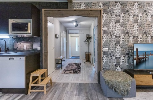 The living room leads to the apartment's lush and sheltered fenced backyard, with natural stone slabs and garden furniture. The yard is fenced all around with a net about a meter high, which makes it also great for pets - you don't have to go for a run right after waking up in the morning, but your pet can enjoy the outdoors right outside the door, which can also be a happy holiday surprise for your pet!