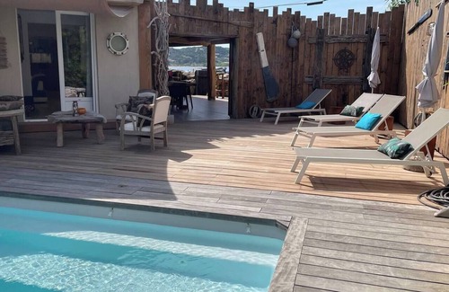 exceptional location !!! villa fifteen meters from the sea !!!! The waterfront in the santa manza gulf fully air conditioned, large wooden terrace with swimming pool, relaxation guaranteed,