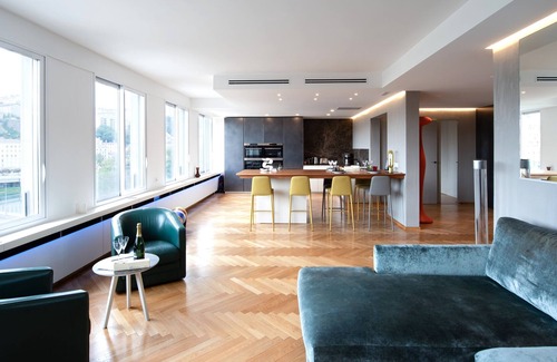 This luxurious 130m² apartment is located on the banks of the Rhône with a splendid view over Lyon, on the 7th and last floor of a beautiful building, with elevator.