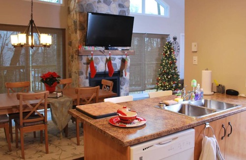 Cette nouvelle construction se trouve en face du bord du lac et a deux étages avec de grandes fenêtres face à elle ainsi qu'un wrap around deck. Il y a deux chambres ainsi qu'une chambre bébé / bébé pour les personnes qui ont besoin d'installer un berceau ou un parc (la chambre bébé est à côté de la chambre principale au dernier étage) .Une autre chambre privée est en bas, adjacente à un grande salle familiale avec canapé-lit et console de jeux Wii. Il y a deux salles de bain complètes ainsi qu'une laveuse et une sécheuse. La maison est dans un quartier boisé calme mais dispose également de toutes les commodités nécessaires pour les familles qui ont besoin de travailler pendant leurs vacances et de rester en contact. Internet haut débit Wi-Fi, télévision par câble avec chaînes françaises et anglaises, imprimante, fax et copieur pour les clients. Il y a des sentiers de marche, de motoneige et de VTT à proximité. Le parking peut accueillir 3 voitures facilement avec une remorque bateau / VTT. Le plancher est en bois dur à l'étage et en vinyle / carrelage en bas.