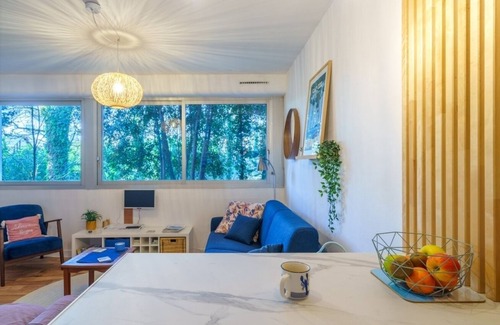 The studio is ideally located in Bénodet, in a very pleasant setting overlooking wooded parkland and not overlooked. All shops, restaurants, cinema, casino and thalasso are just 30 m away, in a lively seaside resort all year round. Fishmongers in the harbor, grocery store in the center and weekly markets nearby. Grocery store, pharmacy, supermarket and fishmonger with live cooked langoustines in 1 min.