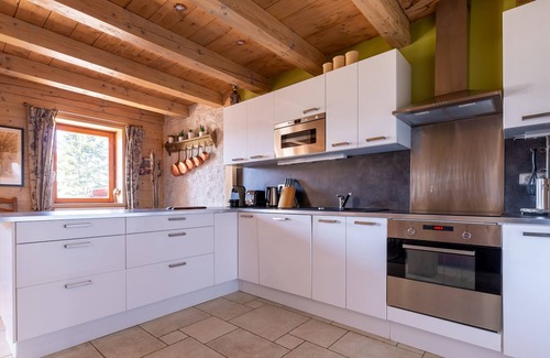 - A modern kitchen, open to the main room and fully equipped: dining table with 3 seats, refrigerator, freezer, dishwasher, oven, induction cooker, raclette machine, microwave, toaster, kettle, Nespresso coffee machine...