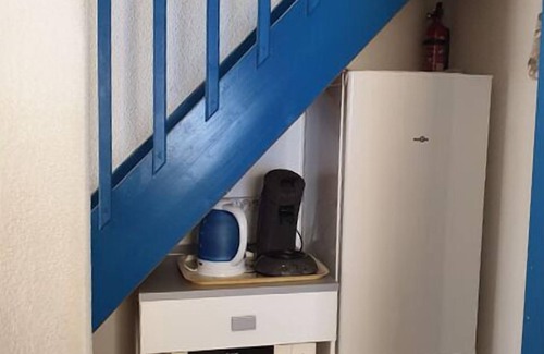 It consists of a living / dining room with TV corner, Hifi, sofa, a large dresser and a pantry, a table and its chairs. The small fitted kitchen is very functional with washing machine, oven, hob, sink etc ... and under the stairs just opposite, there is the fridge / freezer, the microwave, the kettle and the Senseo. The bathroom and WC are separate.