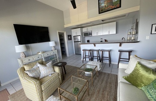 Take it easy at this unique and tranquil getaway. Lower level condo containing two queen bedrooms with en-suite bathrooms, both ocean view. Full kitchen and living area. Large balcony with dining area and lounge chairs, with doors that completely open for an indoor/outdoor living experience.
