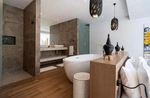 A modern and contemporary 2 bedrooms, with a private pool surrounded by tropical trees and lush gardens. The design embodies luxury and comfort, only warm colors are used in the interior to create a special coziness.
