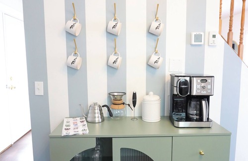 On the other side of the main floor you will find the fully equipped kitchen with coffee station that provides pour over coffee and automatic 12 cup drip coffee machine with single serve brewer option (reusable k-cup). Try the complimentary, local grounds we provide in our coffee canister.
