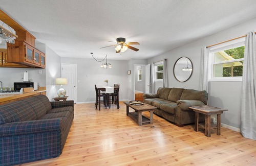 Main level features great room with full size pull out sofa, couch, flat screen TV, dining area, kitchenette with oven/cooktop, microwave, sink, standard coffee maker, and full size fridge. Half bath with full size washer/dryer. Upper level features bedroom with queen bed, twin bed, flat screen TV, desk space as well as full bath with stand up shower. Back yard features firepit area with Adirondack chairs. You can also walk to the shared lake space that features a dock, covered picnic shed area and firepit with build in seating.