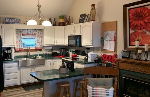 Welcome to our quaint Cabin! Super cute and comfortable fully equipped cabin! When you drive up you will find a great view plenty of parking for all the your boats and toys! The large front covered porch offering plenty of seating. Once you enter the Cabin you will be very delighted to find a very open and airy living space offering cathedral ceiling and an awesome lake view! The eat-in kitchen is fully equipped and has plenty of seating, dining table and bar area. The kitchen is open to the living room. There is a large second full bath that also offering a laundry area as well. The first floor large Primary bedroom has a very comfortable King size bed and private bath that has a beautiful lake view to wake up to! Second floor bedroom offers two queen size beds. There is very large covered rear deck with plenty of seating to sit and enjoy the lake and mountain views and watch the boats go by. If you’re a early riser, you just may spot wild life feeding in the yard. Also under the rear deck area there is a ping pong table, portal basket ball hoop (bring your ball) corn hole game and large Jenga game and a fire pit is in the front yard. Sunset Marina & beach within 7 min drive. You wont want to leave this tranquil cozy cabin, very serene! Enjoy your stay!