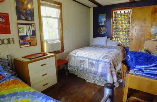 This whimsical Monroe County getaway comfortably sleeps nine with a queen bed on the main floor, a queen, single bed and a trundle in the upstairs master bedroom,and a queen and single bed in the other upstairs bedroom.