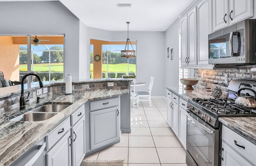 Time for outdoor paradise! The backyard in this beautifully remodeled 4-bedroom home has a heated pool* with spectacular lake and golf course views. This property also includes a bronze club membership (or Platinum unlimited golf membership at an additional fee) to Heron Creek Golf and Country Club available, membership will be transferred during your stay allowing unlimited access to the clubhouse, workout facilities, tennis and dining, all only a short walk from the home.