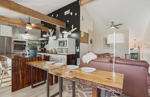 The 2nd floor deck has seating for 10 guests. The kitchen butcher block island has 4 bar stools. There are 2 live edge tables that extend off the island that can sit 8 guests. There are plenty of cups, plates, and silverware for 10 guests.