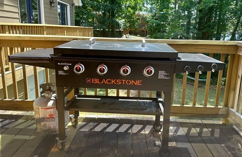A big deck facing the lake with a fabulous grill, umbrella with table and chairs.