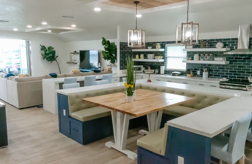 The kitchen is fully stocked and has ample seating for your group of 15. The living room is perfectly staged for night-time movies and relaxing after a long day on the lake. The outdoors is the focus of this home. Every area of this home has been completely renovated and staged for your group to spend a fun time on the lake. The home has plenty of kayaks, paddle boards, a canoe, and a pedal boat. There's no doubt that your time at this home will be filled with adventure and fun.