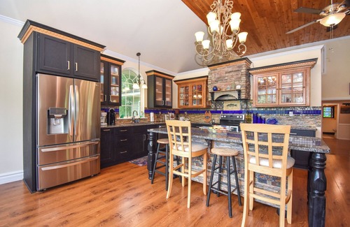 Gorgeous, custom kitchen and great room with fireplace and 12 ft ceilings. iRobot/Rooba auto vacuum in kitchen/dining area. 4 separate decks/patio areas including upper-level open deck, a screened deck with swing, multiple seating area and stereo Bluetooth speakers, a mid-level open/covered deck with LED accent lighting and a lower-level patio. Parking for many cars available on large, concrete driveway. Full refrigerator with ice maker and ice/water thru door set up in the garage for dockside/entertainment use. Rolling cooler in the garage for dockside use too. Dedicated Fire Pit area near dock, with built in seating!