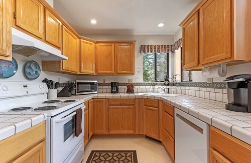 On this floor, you'll also find two bedrooms, both furnished with king beds and facing the tranquil forest. Upstairs, a loft space features a cozy couch and a 22" TV for additional entertainment. There's another bathroom on this level, as well as a separate room with two sets of bunk beds.