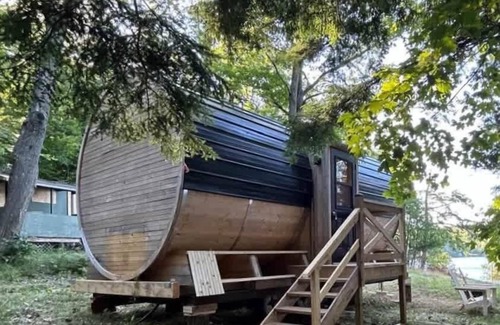 Escape to the charming Barrel Cottage at Mill Lake near Parry Sound, designed for two people looking for a quiet getaway. This lakeside retreat offers beautiful views of the lake, perfect for those looking to relax in nature. The barrel has a private fireplace where you can enjoy a stellar night. The sandy beach and pier are just steps away for swimming, kayaking, or just relaxing along the shore. Ideal for a quiet retreat close to nature.