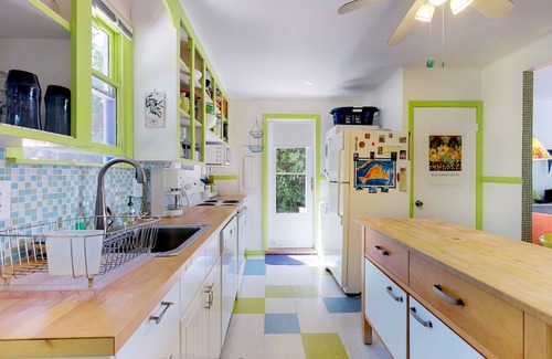 The blue-and-green motif continues in the full kitchen, which features butcher block countertops, full-size appliances, and even a dishwasher to handle the clean-up. Use the lobster pot to boil freshly caught seafood, and sit down for dinner at the spacious indoor dining table. The home is equipped with a private washer and dryer. The living room area has an A/C minisplit which will help you feel cool and comfortable in the summer months.