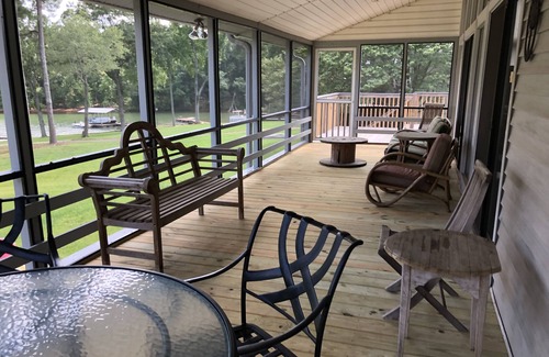 Welcome to our home away from home. This perfect 3 bedroom 2 full bath home has four beds that will comfortably sleep 8 people. The great room and kitchen are open to the large covered and screened porch. Enjoy the beautiful open water view from inside or while relaxing on the porch. The master bedroom has a king size bed and it’s own full bathroom. The other two bedrooms have a full bed and double full bunk beds. These bedrooms share a full bathroom accessible directly from each room. There is also a pull out couch in the great room if you have that extra guest that needs a spot also. The large screen porch opens to a deck area for grilling or relaxing in the sun. The lake is a gentle walk from the house with a dock and deep water. Spend your vacation on the new dock installed this year. Bring your boat and enjoy all that Lake Hartwell has to offer. You are welcome to dock your boat / jet ski or rent a boat from a local boat rental location. Our home is located less than 2 minutes from Interstate 85 and only 1/4 mile from the closest boat access ramp. The local marina is close by with a fuel dock available. We are in close proximity to several local lake access restaurants and a 30 minute boat ride to go see the Clemson Tigers. Come enjoy a relaxing vacation on Lake Hartwell and make our home yours for the week!!