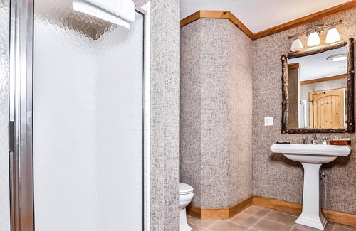This lakefront charmer hosts four bedrooms. The main bedroom has a small seating area, lake views, deck access, and an en suite full bath with a tub/shower combo. There are two well-appointed bedrooms with bunk beds, perfect for the kiddos, while the fourth bedroom has two comfortable beds, an en suite bathroom, and deck access.