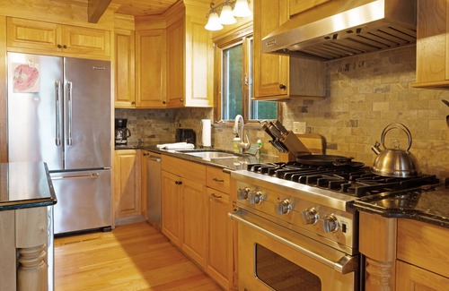 The setting is very private on a quiet waterfront peninsula, and you'll have a wood stove on the lower level for plenty of cozy ambiance. This home also has air conditioning.