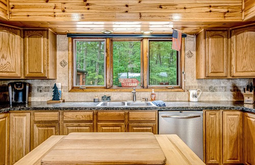 Inside this spectacular, two-story log cabin, you'll find an open, well-equipped kitchen with brand new appliances (updated in 2024!) and counter seating as well as a dining area with a table for mealtimes or family game nights. The great room on this level also includes a spacious main living area with a vaulted ceiling, comfortable furnishings, a wood-burning fireplace, and a TV for streaming your favorite channels.