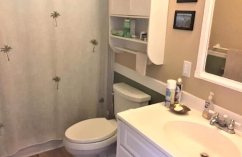 The lake house, which has central air conditioning, has four bedrooms and a loft above the living room (which has four single beds for children only). The downstairs has two bedrooms (each with a king-size bed), a bathroom with a walk-in shower, a half bath, a laundry room and a small game room with a TV and a bundle of games and books. The upstairs features a large living area with a big TV, a kitchen (which has all the amenities and utensils), a bathroom, and two bedrooms with queen size beds.