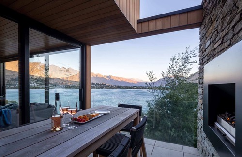 Luxury split-level villa with lake and mountain views, just three minutes from Queenstown centre. Features include parking, AC, fireplace, private balcony, and modern open-plan living — perfect for couples, families, or small groups year-round.