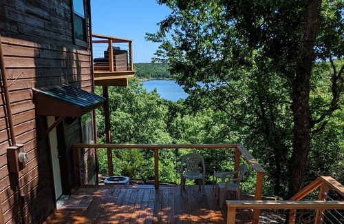 The Lakeview Chalet is a cozy, 3-bedroom/2-bath cabin perfect for a romantic getaway or a fun family vacation in the Arbuckle Mountains of Sulphur, Oklahoma. Perched on a hill above the Lake of the Arbuckles amidst Oak Trees, the home reveals an amazing view of the lake. Two of the bedrooms are furnished with a queen size bed, the bedroom on the first floor has a Murphy bed and a sleeper Sofa. A sleeper sofa has also just been added to the living room