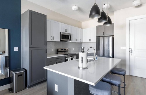 Enjoy skyline views and urban energy at Skyview at Crawford, located in the heart of Fort Worth just steps from downtown and half a mile from the Texas A&M campus. Perfect for flexible, monthly, or extended stays, our fully-furnished apartments feature a full kitchen with quartz countertops, stainless steel appliances, and a kitchen island, plus in-unit laundry and walk-in closets for extra convenience.