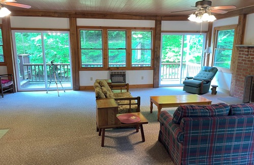 Located on Buck Run with a beautiful stocked pond, yard, plaza with large outdoor firepit and gas grill. Four bedrooms and three and a half baths, great for families and groups. Nice pets are welcome. Room for RV's and extra cars. This is great for hunters, bike riders, hikers, motorcyclers, writers, nature lovers and fishermen. There is a very nice , clean and well lit kitchen. The huge dining room table is the home's center. Also in the kitchen area is the living room with a huge stone fireplace. The large great room has another fireplace, kids area, reading nook and many other uses.