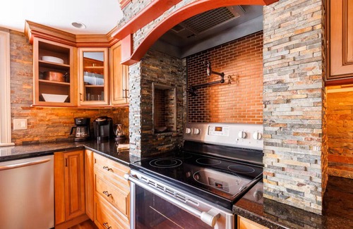 The well-appointed kitchen features a large granite island, slate and copper walls, illuminated arched ceiling alcove, and a river-view breakfast porch. The kitchen is outfitted with:
