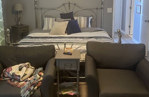 This is a one bedroom, one bathroom downstairs room in our home. It has a king size bed, a 55 inch tv, a table and chairs to eat dinner, and two lounge chairs for watching tv. There is also a full size refrigerator for your own use. It has an en suite full bathroom with tub and shower. We have two cats that will not be in the room - in case you are allergic to cats. There are seven stairs up to the entry door and seven stairs down to the private room. It accommodates 2 with the king size bed and 2 more with an optional blow up queen size bed. The parking is in front on our house and not in the driveway.