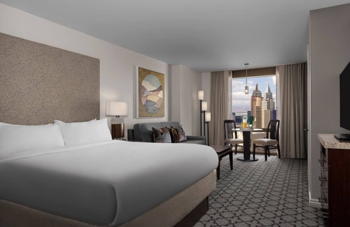 Be close to all the action of the Las Vegas Grand Prix. Walk into a Grand entrance with a restaurant, bar and lounge to your right. There is a mini market/coffee spot for all your quick needs. Exercise room with all the equipment needed to get your sweat on. Rooftop pool and bar.