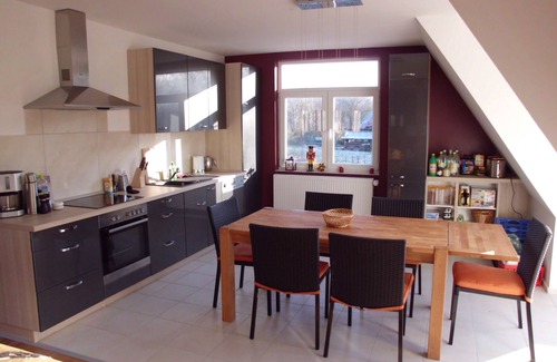 The apartment has its own entrance on the upper floor and is functional and modern. The open kitchen meets today's high standards and is equipped with all the necessary household appliances such as a coffee machine, stove / oven, refrigerator, freezer, dishwasher, etc.