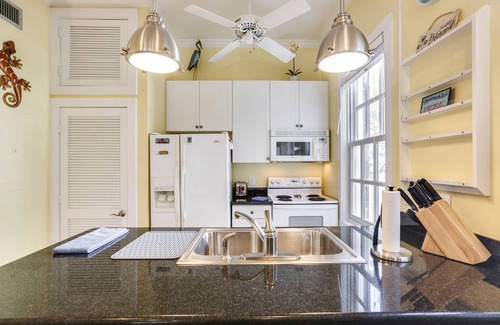A gleaming kitchen with appliances and a granite counter has everything you'll need in your home away from home. The Lazy Gecko - your perfect location to explore the Conch Republic!