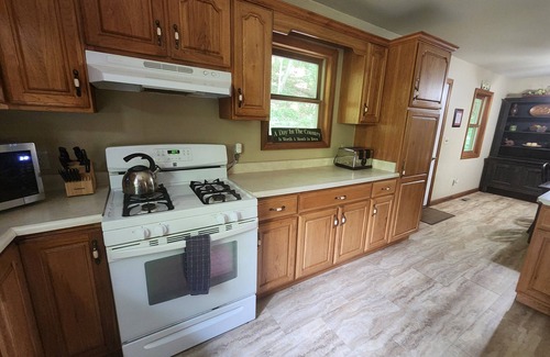 Listen, what do you hear? Only the sounds of nature located on 27 acres of serene woods and tucked in a hollow, Lane’s End is the ultimate in privacy for the perfect woodland retreat. This vacation home accommodates up to 10 guests comfortably with a floor plan that provides privacy and areas for adults and children. Very family friendly with a large kitchen and dining area adjacent to the family room with satellite TV. Adults can escape to another private living room also with satellite TV. Down the hall is a large bathroom with shower and tub. Also down this hall are 3 very roomy bedrooms. One has a queen bed, another with a queen and a twin and the third is a bunk room with 2 twins and 2 full beds. You’ll find a laundry room just off the bedroom area. Outside you will find a wraparound deck. The backyard also affords lots of privacy where you can picnic beside a babbling creek on the deck or build a campfire and stargaze. Explore the 27 acres of woods and you’ll discover towering rock formations on the property.