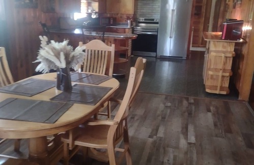 This charming vacation cabin comfortably sleeps six with three cozy bedrooms—one with a king bed and two with queen beds—offering restful nights after a day of adventure. The full bathroom features both a tub and shower, and the fully equipped kitchen and dining area make it easy to enjoy home-cooked meals by the warmth of the fireplace.