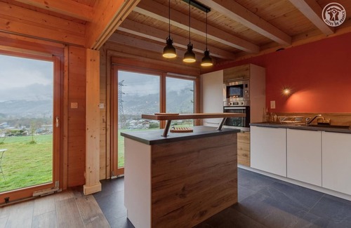Individual chalet with access via steps from the private parking space. Entrance with separate WC, living room-kitchen. On the 1st floor: 3 bedrooms (1 double bed 140 x 190 cm / 1 double bed 140 x 200 cm and 2 single beds 90 x 200 cm / 1 double bed 140 x 200 cm). Bathroom (shower) and separate WC. South-west facing garden and north-facing gravel terrace, crossing balcony to the side of the house. Basement with storage (sports equipment), wood reserve, extra fridge and washing machine (with temporary staircase). Raised door sill and exterior openings. Recent chalet at the exit of Bourg Saint Maurice, towards the ski resorts. Refined mountain decoration, combining natural materials and contemporary touches. With its furs and blankets, it's a real cozy nest. The living rooms are bright and well exposed. With its central island, the kitchen is welcoming and offers a clear view of the valley and the Tarentaise mountains.