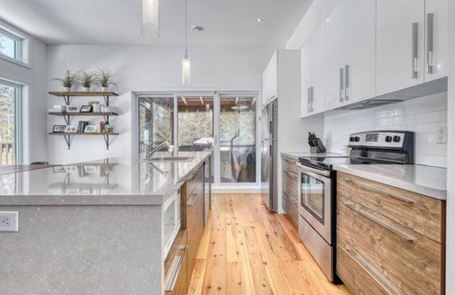 Our modern chalet is perfectly situated on the water's edge to offer a relaxing vacation experience. Whether you're planning a getaway with family or friends, our chalet will meet all your needs. The grounds are intimate and bordered by forest.