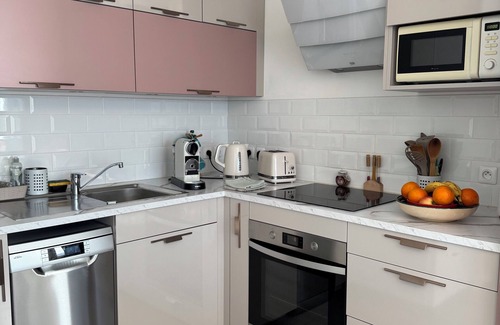 - Open kitchen: Functional and modern, the kitchen is fully equipped (oven, microwave, dishwasher, coffee machine, kettle...). It allows you to cook independently during your stay.
