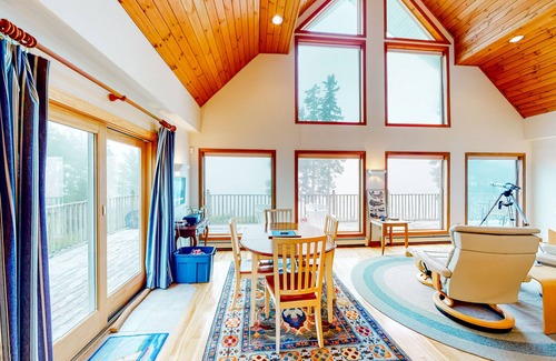 Welcoming you in, the light-filled living room is composed of vaulted ceilings, large windows, and comfortable furnishings. Gaze out the telescope, gather around the heat of the wood stove, and engage in some playful competition over a family board game night.