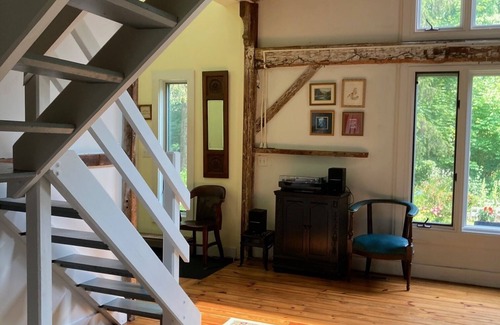 This bright and charming tri-level house is a stone's throw to Lenox, MA. With an open living area, the house has ultra high ceilings, skylights, and a Vermont Castings stove. Two main bedrooms are between the primary and top floor and share a bathroom. The third bedroom is a ground / basement level room with its own bath and kitchenette. There's formal dining area which can accomadate a large dinner party (with extra table leaves) plus a table for two in the kitchen. The main bedroom has a custom made four poster queen bed, plenty of closet space, and a screened porch off the room. Blackout curtains are througout, and an HEPA air filter for the entire house, A/C units for the bedrooms, and large ceiling fans in the LR and DR. The kitchen is fully stocked with an abundance of dishware and cookware. Fabulously located in the heart of the Berkshires, this quaint, comfortable, and private house is the perfect getaway for your Berkshire trip any time of the year.