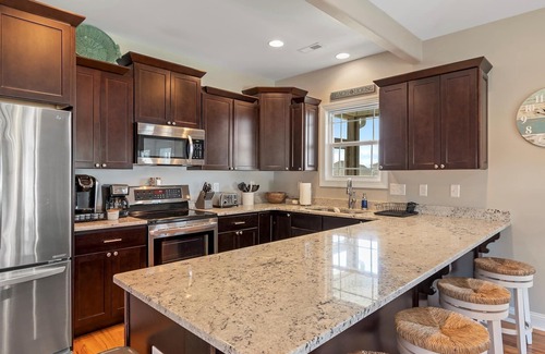 - Kitchen: Large breakfast bar. Granite countertops. Stainless-steel appliances. Refrigerator with ice maker. Electric range with flat-surface cooktop. Dishwasher. Built-in microwave. Garbage disposal. Keurig coffee maker. Toaster.
