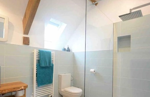 Upstairs the bedroom has under floor heating with a bathroom en-suite with an Italian shower. The bedroom has a vaulted ceiling with the original oak beams. A Super King size bed which can be split should guests prefer twin beds. (summer or winter tog duvets) For your added luxury you will have large bath sheets, hand towels and bath robes for your use. All our linen is 100% cotton.